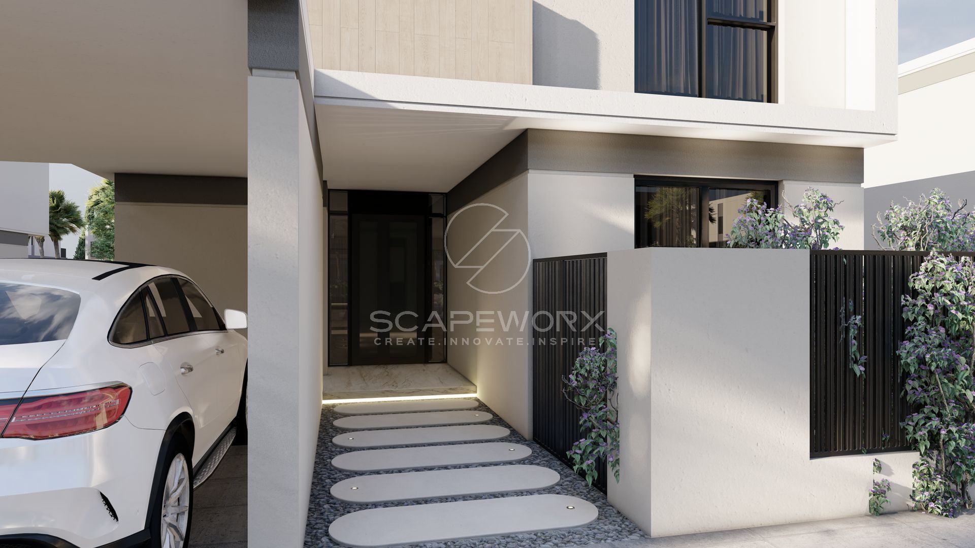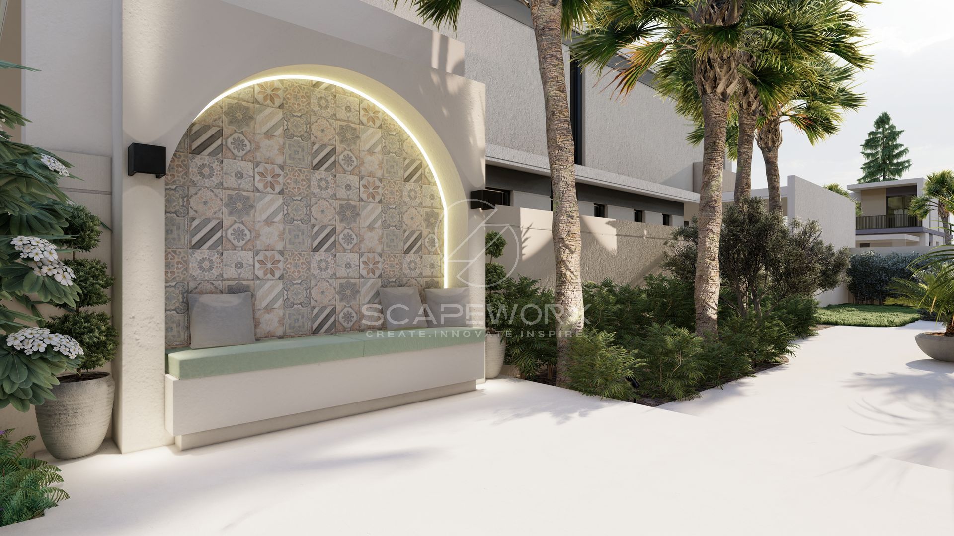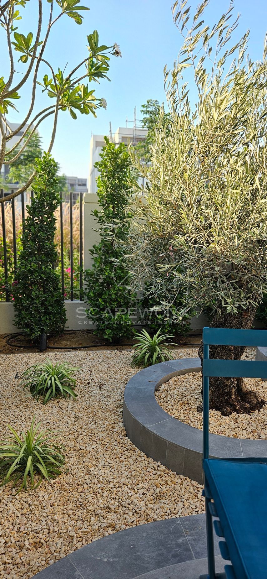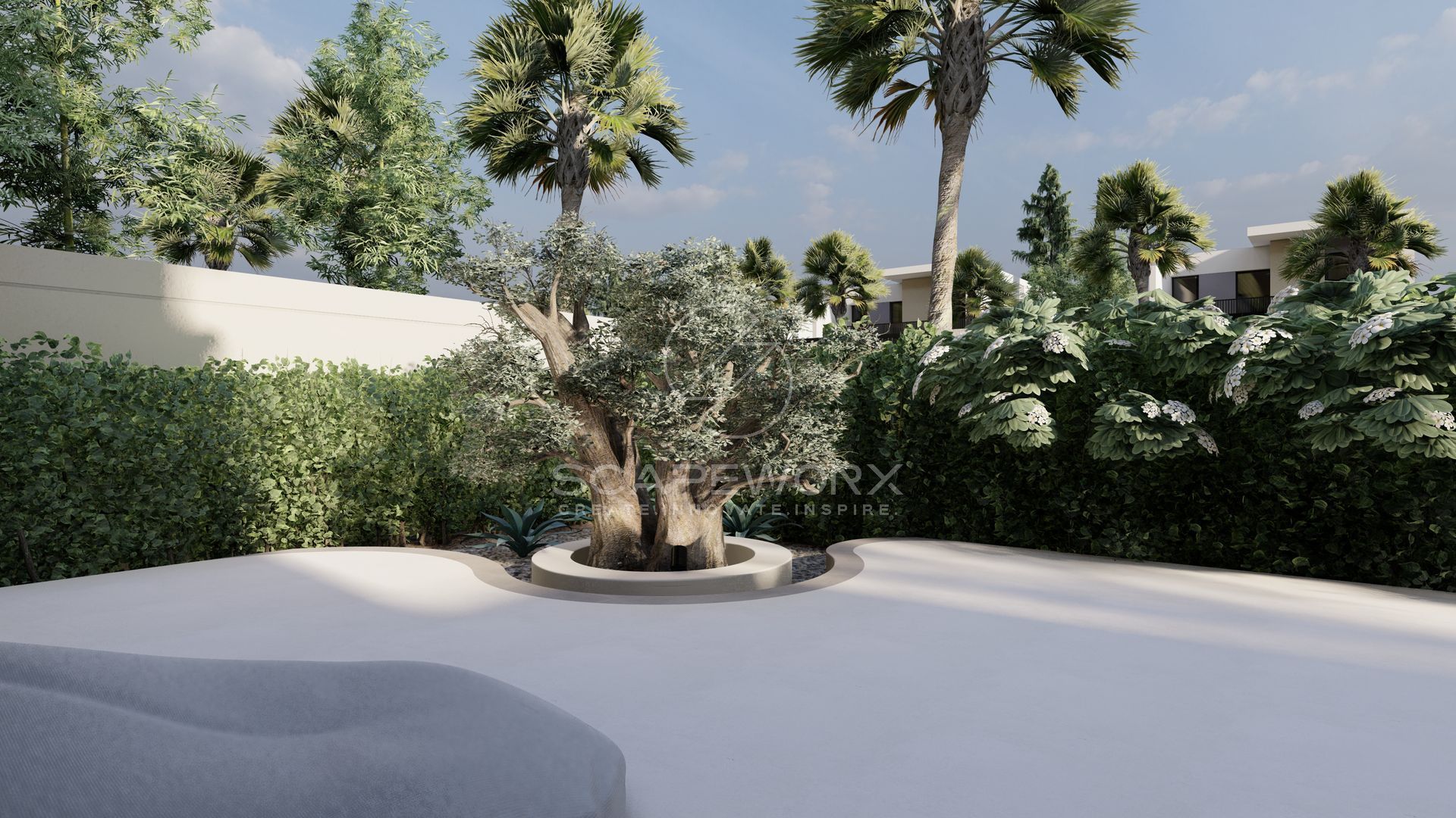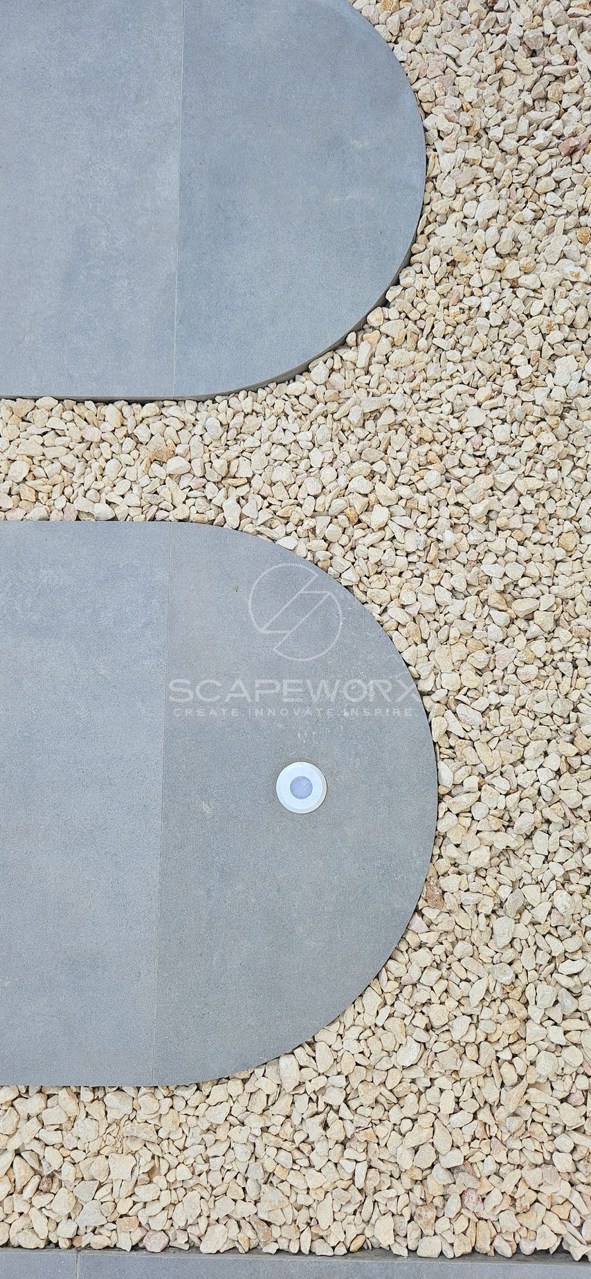 At this concept we soften the rigid edges of the architecture with organic curvature at feature planters and stepping stones, while maintaining the functions of the space and limiting the wastage without compromising on the aesthetics.