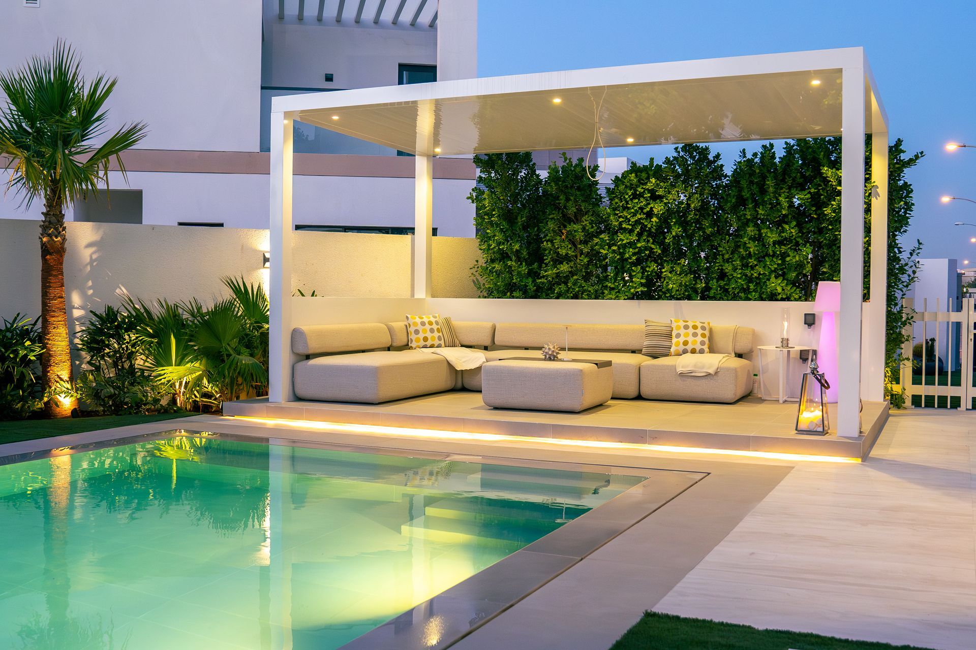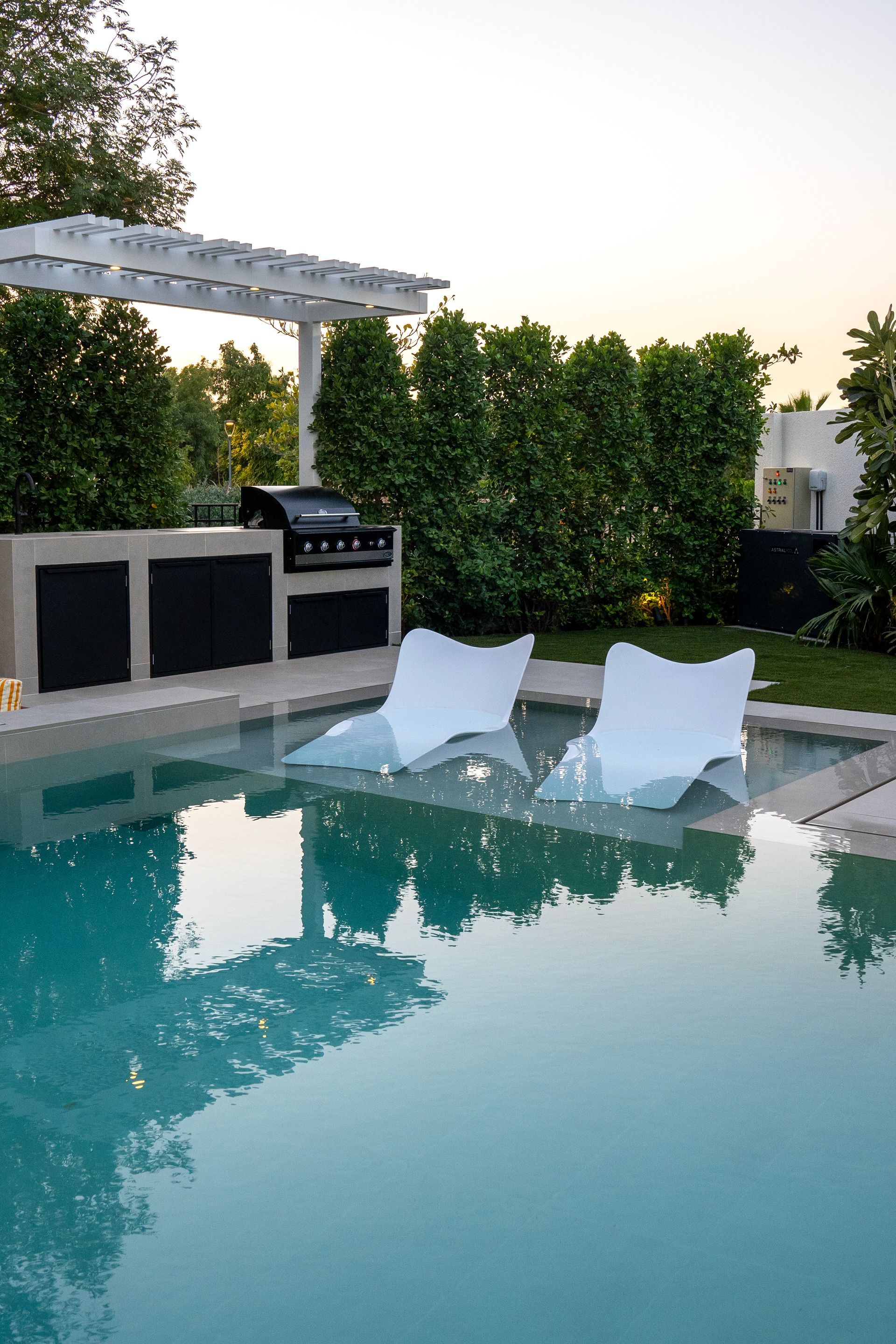 An outdoor oasis in Damac Hills! This stunning backyard transformation features a luxurious infinity pool with a glass wall, a sunken firepit lounge, and lush greenery—creating the perfect balance of elegance and relaxation. A true masterpiece by Scapeworx!